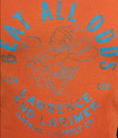 I was pumped when I saw a version of this t-shirt being worn by someone on the Denver Nuggets’ bench during their NBA championship run last year, and when I asked John he told me lots of the Nuggets have Lawrence & Larimer gear. I get it, because the phrase “Beat All Odds” was perfect for that team.